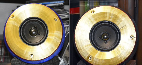 下段左の赤い輪はSPユニットの厚さを補償するスペーサーだ。PETGフィラメントで成形した。