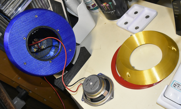 下段左の赤い輪はSPユニットの厚さを補償するスペーサーだ。PETGフィラメントで成形した。